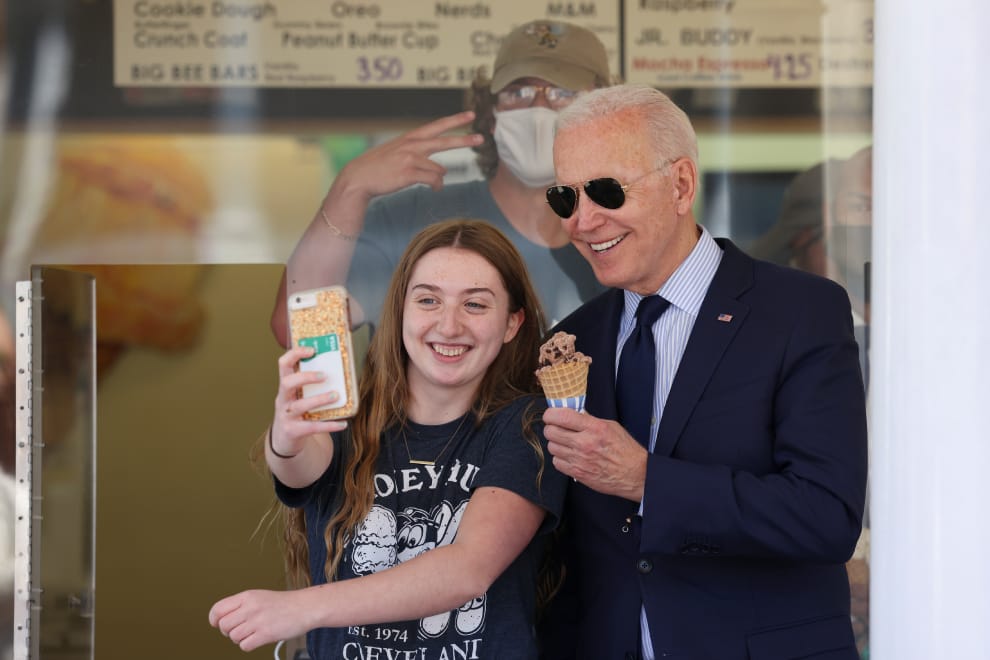 在俄亥俄州的城市克里夫蘭(Cleveland),一名來自冰淇淋店「Honey Hut」的員工正興奮地和出訪到此地的美國總統拜登(Joe Biden)用手機自拍合照。