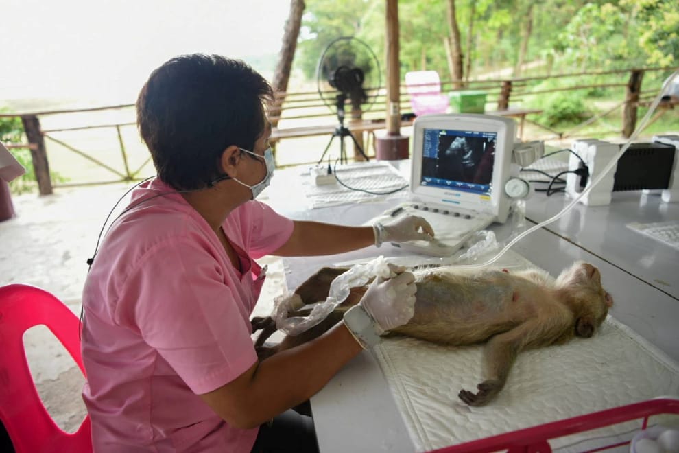 在那空那育省(Nakhon Nayok)的一間動物醫院,一名獸醫正在用超音波幫猴子「產檢」。這隻猴子及牠的同伴,都是在前日的一場走私未遂的行動中被查獲的。