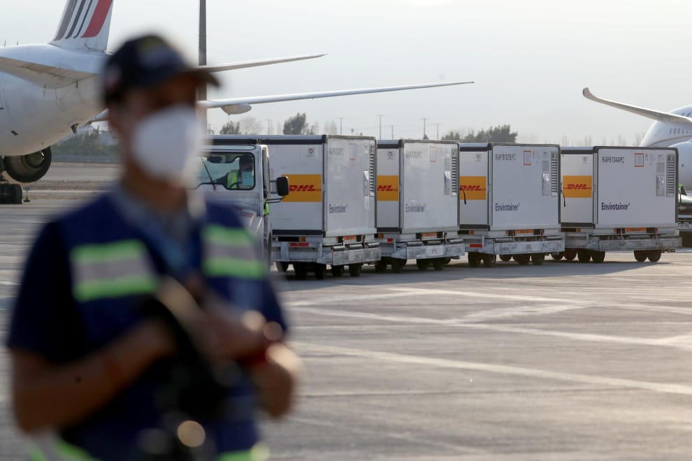 在智利COVID-19(武漢肺炎)疫情持續延燒的情況下,第一批由中國康希諾生物(CanSino Biologics)所開發的疫苗在 28號這天送抵了首都聖地牙哥(Santiago)的阿圖羅·梅里諾·貝尼特斯准將國際機場(Arturo Merino Benitez International Airport)。畫面中,一名安全部隊成員正在停機坪上看守裝著疫苗的貨櫃。