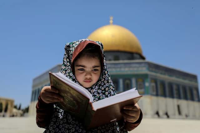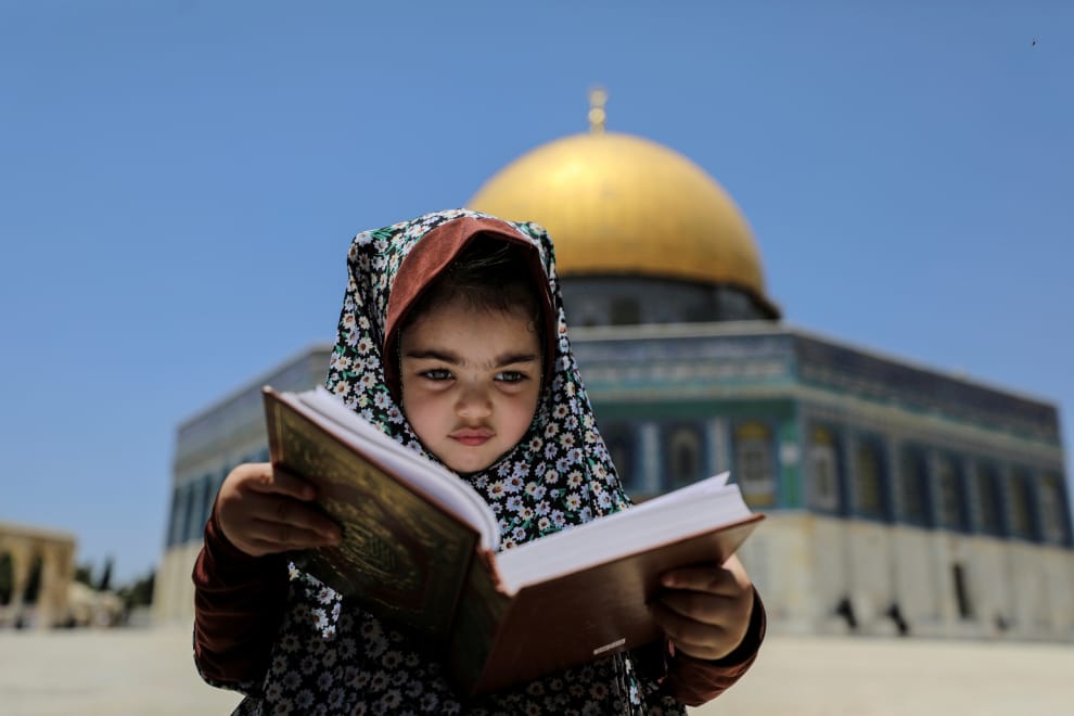 在耶路撒冷(Jerusalem)舊城區,一名小女孩坐在阿克薩清真寺(al-Aqsa Mosque)外,專注地看著她手上的那本聖典,她身後的建築物,則是耶路撒冷最著名的地標之一「圓頂清真寺」(Dome of the Rock)。
