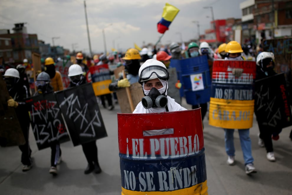 在首都波哥大(Bogota),大批民眾走上街頭,要求政府處理國內貧窮、警察暴力,以及醫療和教育系統資源不平等的問題。畫面中,戴著防毒面具的示威者手持用鐵桶做成的盾牌,上面寫著大大的標語「人民沒有放棄」。