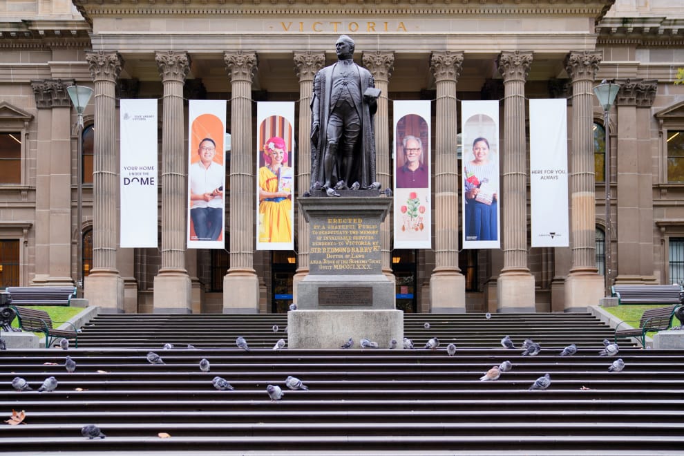 為了遏止COVID-19(武漢肺炎)疫情的擴散,澳洲的維多利亞省(state of Victoria)從 28號這天開始進行為期 7天的封城行動,位於墨爾本(Melbourne)的維多利亞州立圖書館(State Library of Victoria)也因此變得空無一人,只有數十隻的鴿子在階梯上走來走去。