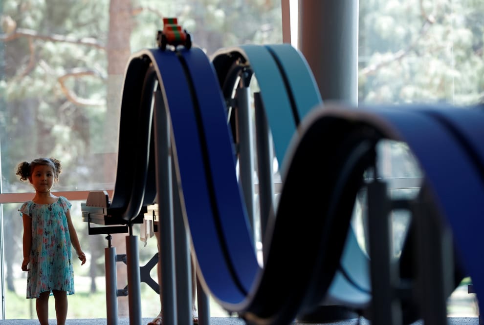 在因COVID-19(武漢肺炎)而關閉一年多後,洛杉磯(Los Angeles)近郊希爾馬(Sylmar)的科學博物館「Discovery Cube」於 28號這天重新開放。畫面中,小小遊客莎雅(Shaya)正在物理實驗室區(Physics Lab)盡情探索館內的道具以及物理的世界。
