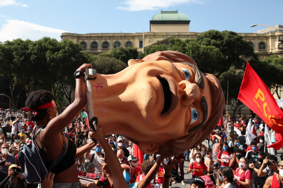 在里約熱內盧街頭,示威民眾丟擲以巴西總統波梭奈羅(Jair Bolsonaro)為創作靈感的頭像,抗議他帶領的政府防疫不力,應該盡快下台。