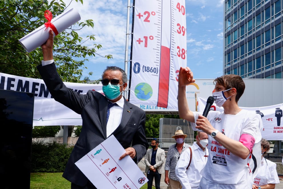 在世界衛生組織(WHO)總部所在地日內瓦,WHO幹事長譚德塞(Tedros Adhanom Ghebreyesus)接下「滅絕反叛」(Extinction Rebellion)環保組織的陳情書,象徵願意替減緩氣候變遷盡一份力。