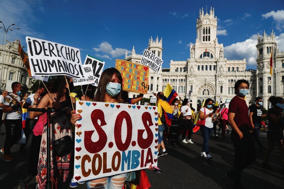 在首都馬德里,大批民眾上街支持哥倫比亞民眾的反政府措施,協助他們一起抗議哥倫比亞總統馬奎斯(Iván Duque Márquez)政府推出的稅改,以及種種哥倫比亞警方執法過當的行徑。其中,一名民眾手舉寫著「S.O.S 哥倫比亞」字樣的海報。