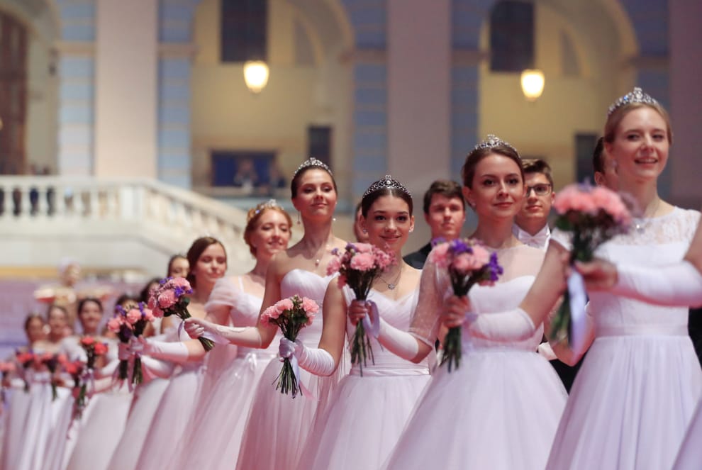 在莫斯科的 14世紀古蹟Gostiny Dvor,裡頭正在舉辦慈善舞會,年輕男女優雅的舞姿吸引眾人目光。