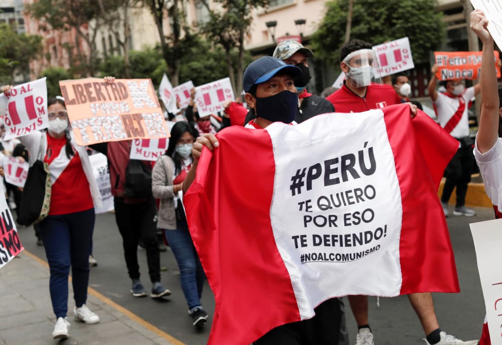 在首都利馬,隨著即將於 6月6日舉行的總統大選近在眼前,反對候選人卡斯蒂略(Pedro Castillo)的民眾紛紛上街遊行,其中一人手舉著寫有「秘魯我愛你,這也是為什麼我要站出來捍衛你,向共產主義說NO」字樣的旗幟示威。