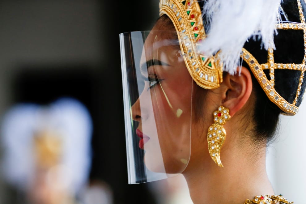 在曼谷國家博物館內,舞者們戴上防疫面罩,準備登台用曼妙的舞姿歡迎遭竊六十年的兩件古物回家。
