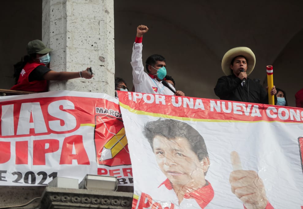 在秘魯人口第二多的城市阿雷基帕(Arequipa),總統大選候選人——來自左翼「自由秘魯黨」(Peru Libre)的卡斯蒂略(Pedro Castillo,右)手拿象徵黨的巨大鉛筆發表演說,他和來自右翼「人民力量黨」(Fuerza Popular)的候選人藤森惠子(Keiko Fujimori)即將在 6月6日決定誰是秘魯下一屆總統。