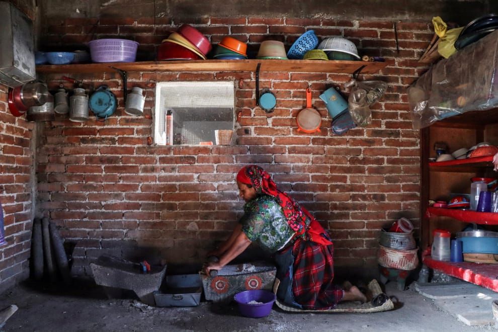 在即將於 6月6日舉行期中選舉的瓦哈卡州(Oaxaca state),一名薩波特克(Zapotec)原民女子正在家中碾製玉米。