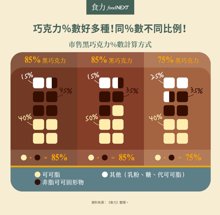 但是否只需要看%數,選%數越高的產品就可以了呢?出產「七七乳加巧克力」的宏亞食品股份有限公司董事長張云綺表示,即使是同樣%數、不同品牌的產品仍會依據添加的原料比例不同,實際可可脂等組成含量也會有所差異。以兩塊同樣標示85%的黑巧克力為例,二者所含有的總可可成分(或稱「總可可固形物」)可能同樣是85%,其他的15%均是由乳粉、糖及其他食品添加物等非可可原料組成。但因為在可可原料中,還包含「可可脂」及「非脂可可固形物」兩種主要成分,因此就算巧克力中總可可成分一樣是85%,兩塊巧克力的可可脂及非脂可可固形物的比例也可能不一樣。