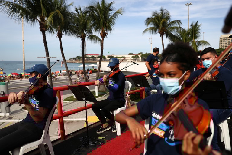 在里約熱內盧街頭,來自「明天之海」(Mare do Amanha)交響樂團的音樂家們在雙層巴士的頂層表演,希望將藝術和文化用更親近大眾的方式帶給大家,而這也是「希望篷車」(Caravan of Hope)計畫的目的。