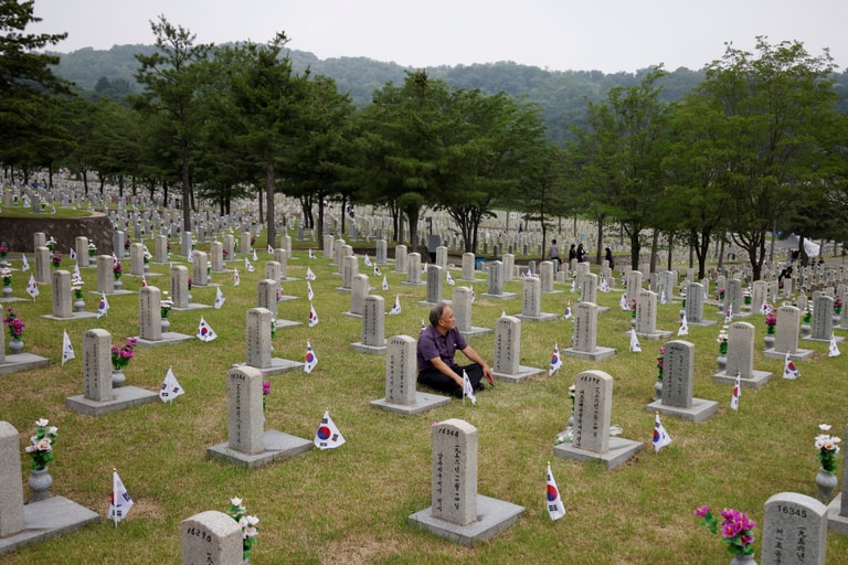 在悼念韓戰及其他戰爭中戰死者的「顯忠日」這天,民眾來到內含軍人公墓的國立首爾顯忠院悼念亡者。