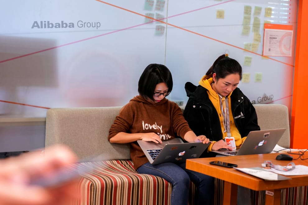 比起接受不斷加班、汲汲營營於加薪升遷的職場人生,「躺平主義者」們選擇看淡這一切,將自己身心的平靜、安詳擺在了萬事之前。圖為兩名在中國電商阿里巴巴辦公室內工作的員工。