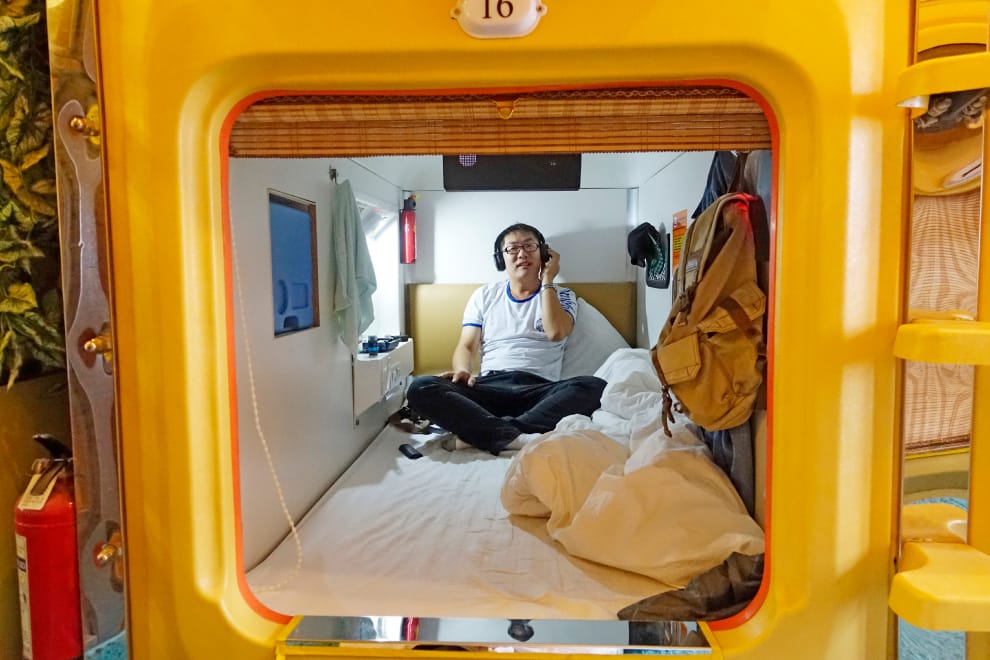 受到躺平風潮的影響,中國的年輕人將自己的物欲降到極低,靠著極低的生活成本「躺平度日」。圖為 2014年時,一名在西安的膠囊旅館裡休息的旅客。