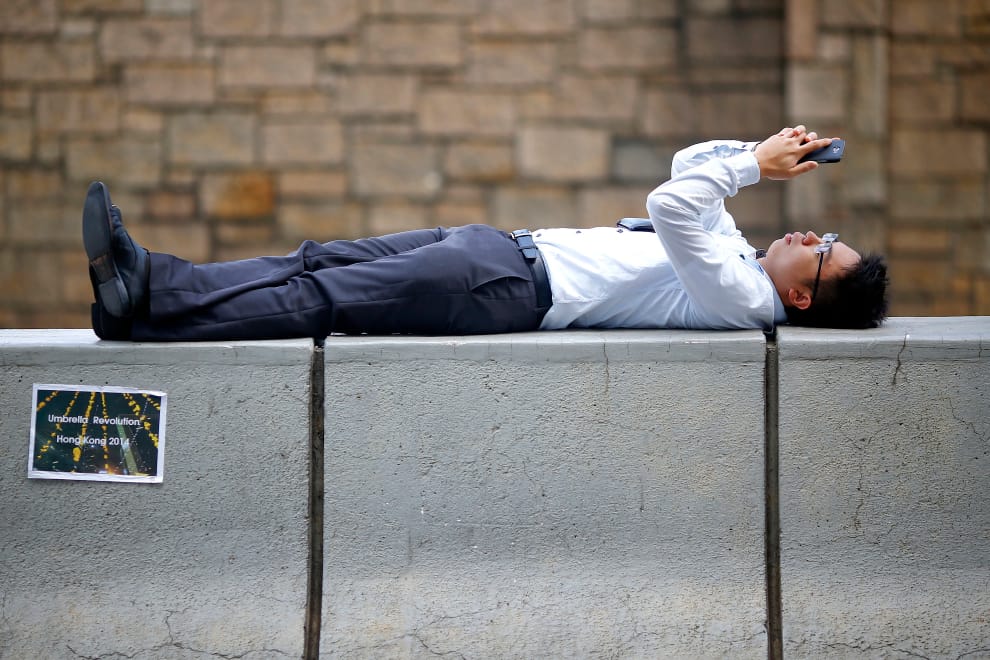 面對高壓、高競爭的社會環境,如今中國年輕人間掀起了一股全新的處世之道:躺平。圖為一名躺在路邊滑手機的上班族。