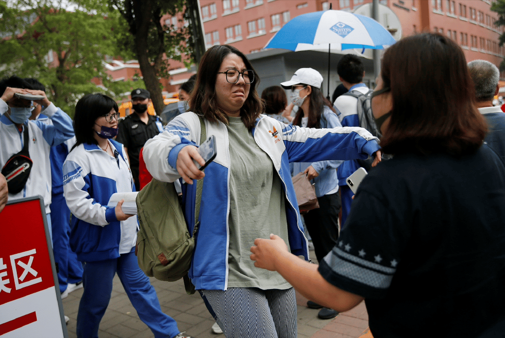 在北京一間高考的考場外,剛考完試的學生和前來迎接的家長擁抱。
