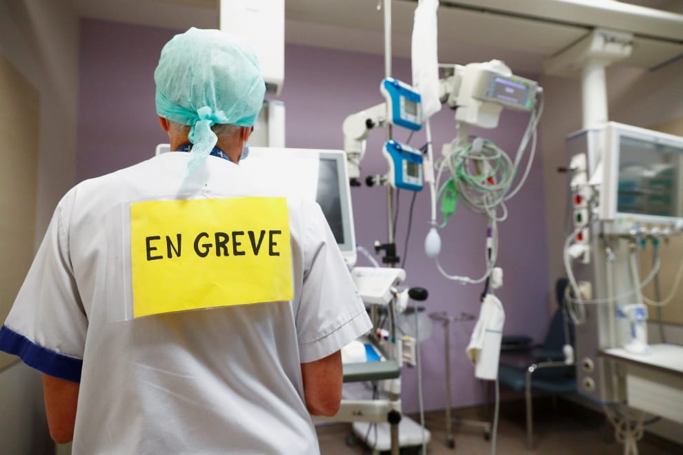 在首都布魯塞爾的伊拉斯謨醫院(Erasme hospital),一名護理師背上貼著「罷工中」的標示,和其他護理人員一同展開無限期罷工,藉此要求比利時當局和醫院管理高層在COVID-19疫情期間提供更好的工作條件。
