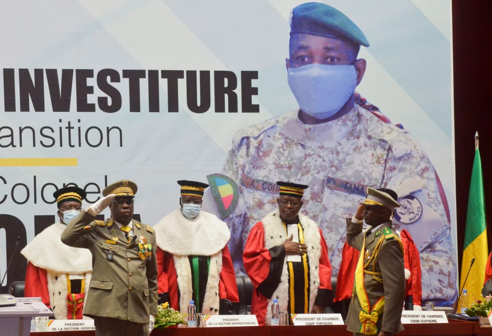 在首都巴馬科(Bamako),帶領兩次政變的戈塔上校(Colonel Assimi Goita)正式就職成馬利臨時總統,圖右揹著馬利國旗色肩帶敬禮者就是戈塔上校。