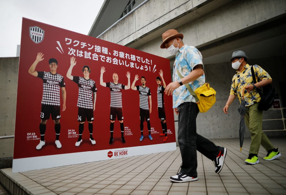 在日本神戶市的御崎公園球技場(Noevir Stadium Kobe)外,兩位路人經過西班牙足球員伊涅斯塔(Andres Iniesta)和隊友們的展板,上頭寫著「感謝您前來接種,下次我們球場上見」。為了加速COVID-19疫苗的施打進度,目前這座球場已經被改建為大型疫苗接種站。