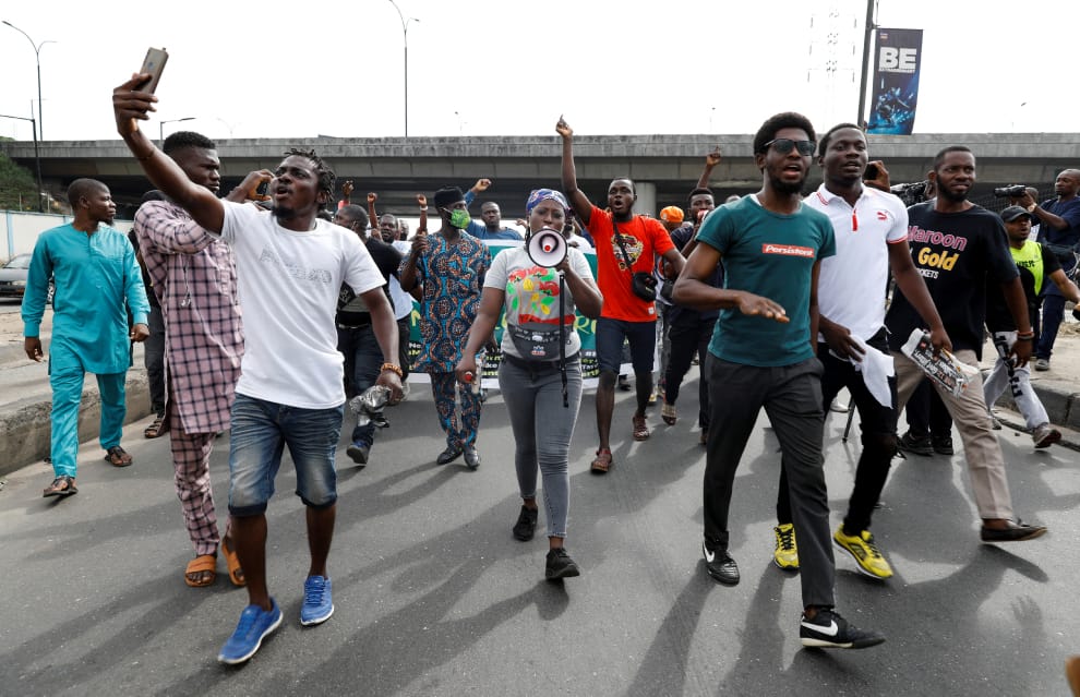 在奈及利亞首都拉哥斯(Lagos)的加尼法維因米公園(Gani Fawehinmi Park),示威者們在「6月12日民主日」(June 12 Democracy Day)上街發動遊行示威。