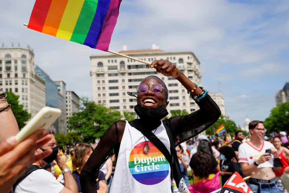 在美國首都華盛頓特區的驕傲遊行上,前來參與遊行的伊貢(Tolu Igun)興奮地在人群中揮舞著彩虹旗。