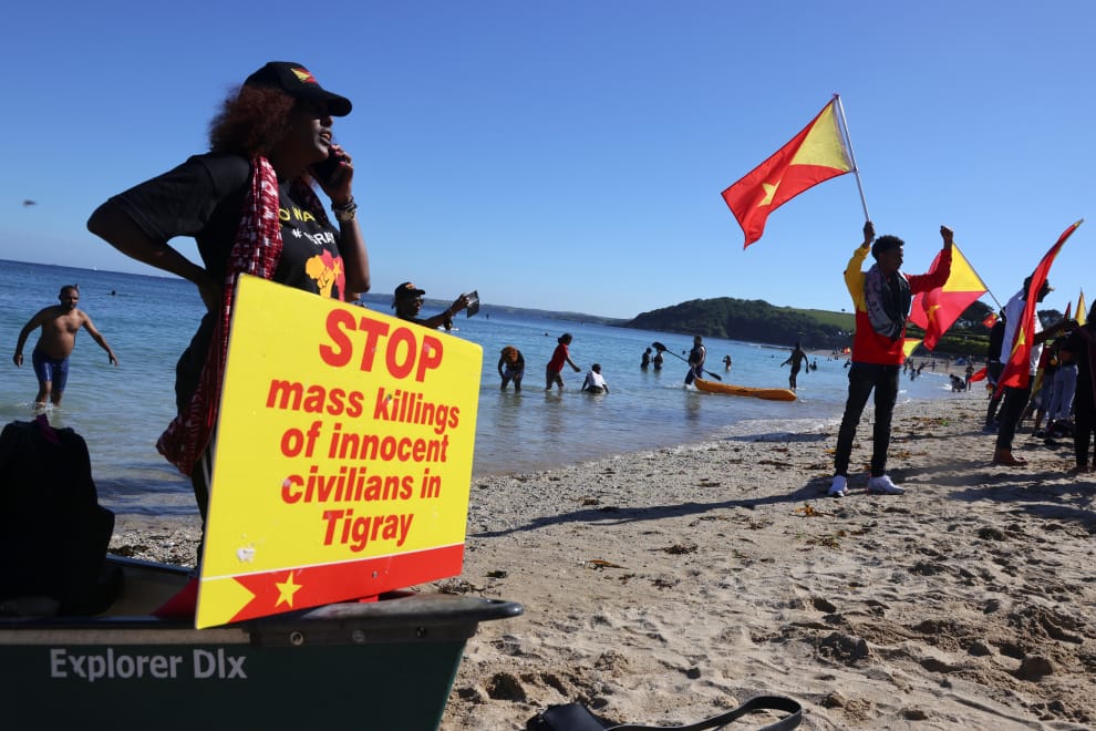 在英國西南端的康瓦爾郡(Cornwall)的吉林瓦斯海灘(Gyllyngvase beach),示威者們在 G7峰會期間帶著象徵衣索比亞提格雷人(Tigray)的旗幟,呼籲各國重視「提格雷人民解放陣線」(Tigray People's Liberation Front,TPLF)與衣索比亞政府間的衝突,並關注這場戰事所造成的飢荒。