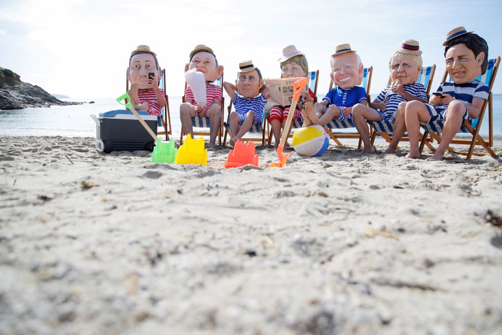 在英國首都康瓦爾郡的斯旺普爾海灘(Swanpool Beach),樂施會(Oxfam)的成員穿上 7國領導人的戲服,參加一場舉辦於海灘上的環保示威。