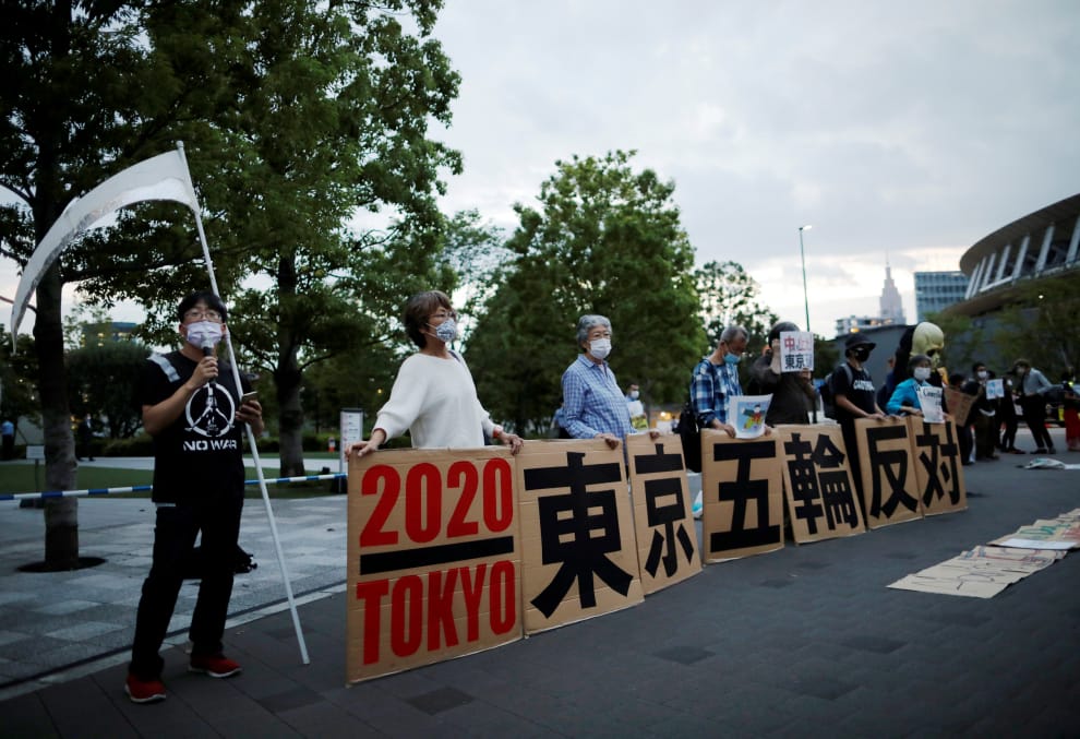 在日本首都東京的日本奧運委員會(Japan Olympic Committee)總部外,反對舉辦奧運的示威者們帶著自製鐮刀、布條,到場抗議日本奧委會不顧國內疫情延燒,執意要舉辦奧運。