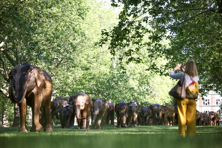 在英國首都倫敦的綠園(Green Park),一名女子對著園內的數尊 1:1大象雕塑拍照。這些大象雕塑都是「大象家族信託」(Elephant Family Trust),特地為「共存」(CoExistence)活動而準備的展品。