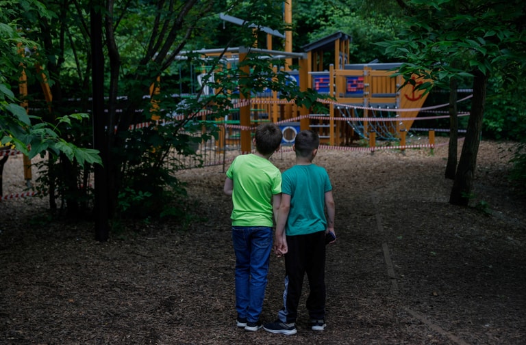 在俄國首都莫斯科,兩名男孩看著因防疫而被當局用封鎖線層層封起的遊樂場。