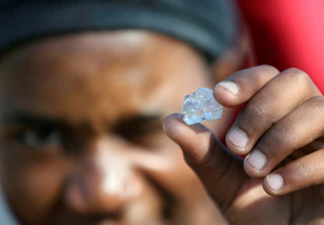 在南非夸祖魯-納塔爾省(KwaZulu-Natal)的誇拉提村(KwaHlathi),一名男子正向鏡頭展示一顆疑似是鑽石的石頭。最近,人們不斷聽聞有人疑似在誇拉提村發現鑽石的消息後,紛紛抄起工具奔向誇拉提村,期盼自己能成為下一個找到鑽石的人。