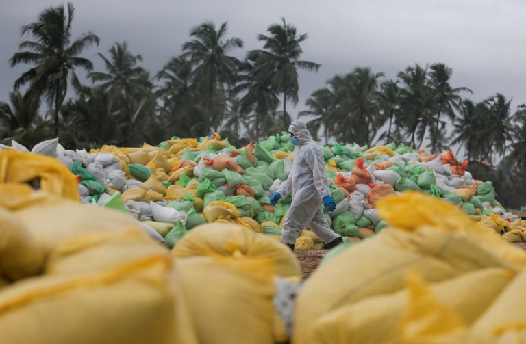 在斯里蘭卡,海軍士兵走過一袋又一袋新加坡化學貨輪X-Press珍珠號(MV X-Press Pearl)燃燒後沖刷上海岸的殘骸。
