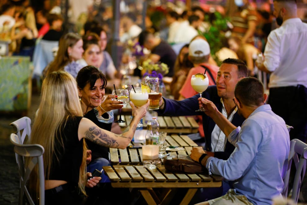在義大利首都羅馬的鮮花廣場(Campo de' Fiori),四位好友舉起酒杯準備乾杯慶祝。最近,義大利放緩了COVID-19防疫措施、取消了宵禁,人們這才有機會在晚上出門,與親朋好友小酌一杯。