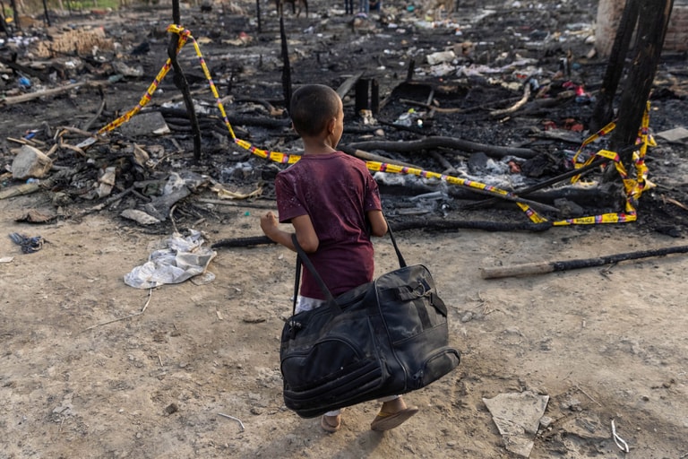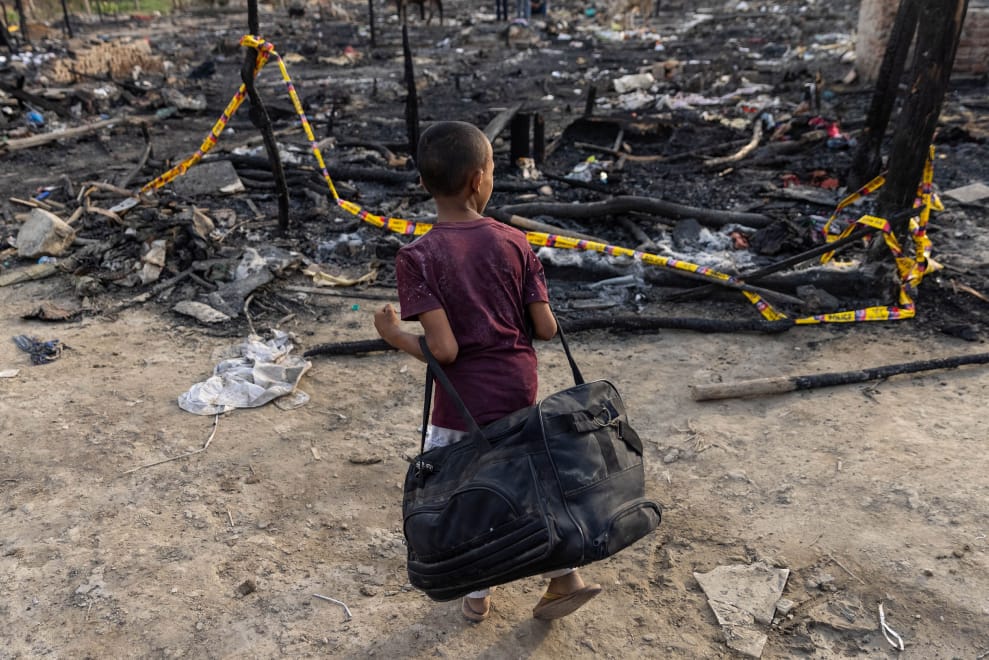 在印度首都新德里,周六(12)晚上的一場大火摧毀了當地的一處洛興雅人(Rohingya)難民營後,一名小男孩獨自扛著家當,準備步行前往附近的一處臨時收容所。