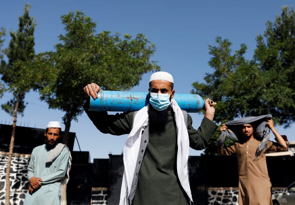 在阿富汗首都喀布爾(Kabul),男子扛著氧氣瓶站在氧氣工廠外排隊,等著再次填充他的氧氣瓶。