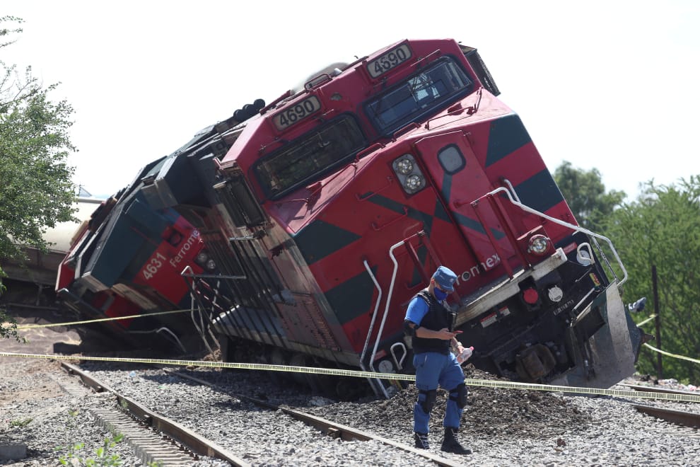 在墨西哥哈利斯科州(Jalisco)的小鎮馬扎特佩克(San Isidro Mazatepec)郊區,一名警察在經過貨運列車出軌現場之際,低頭看了一下手機。