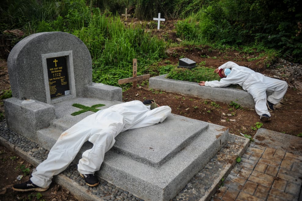 在印尼西爪哇省的首府萬隆(Bandung),兩名穿著防護衣的工作人員在安葬完一名COVID-19死者後,決定往兩旁的墳地上一躺,暫時歇息一會。