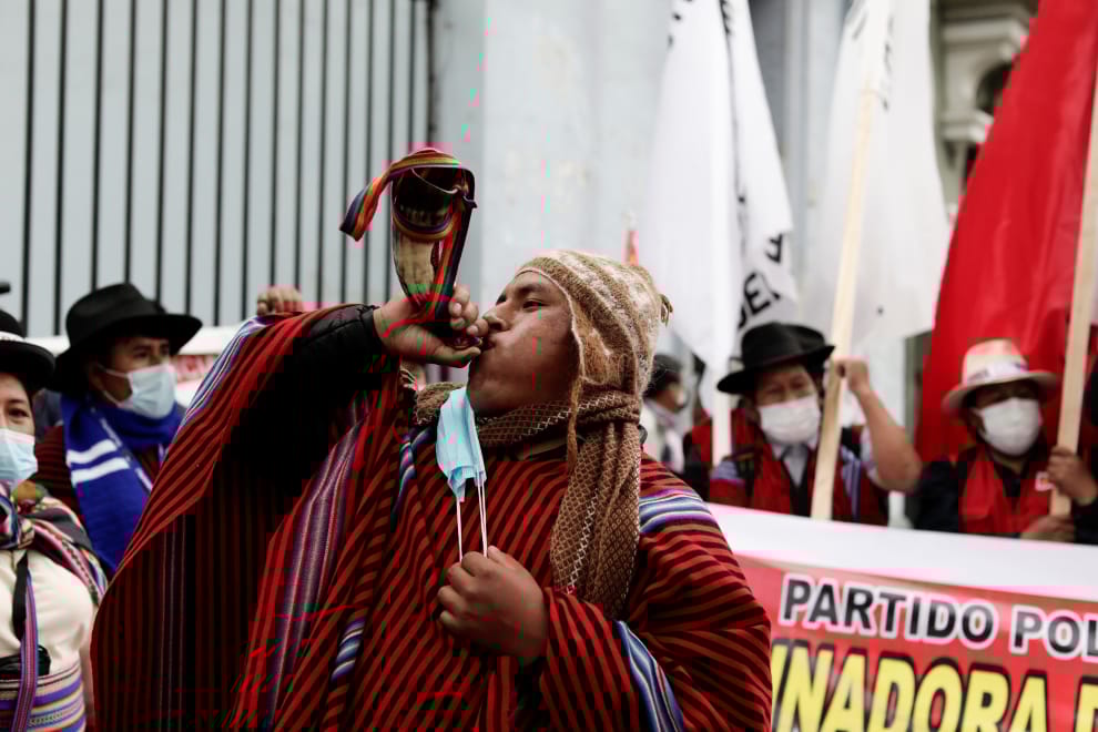 在秘魯首都利馬,自由秘魯黨(Free Peru)總統候選人卡斯蒂略(Pedro Castillo)的支持者拉下口罩,在該黨的總部前吹響號角。