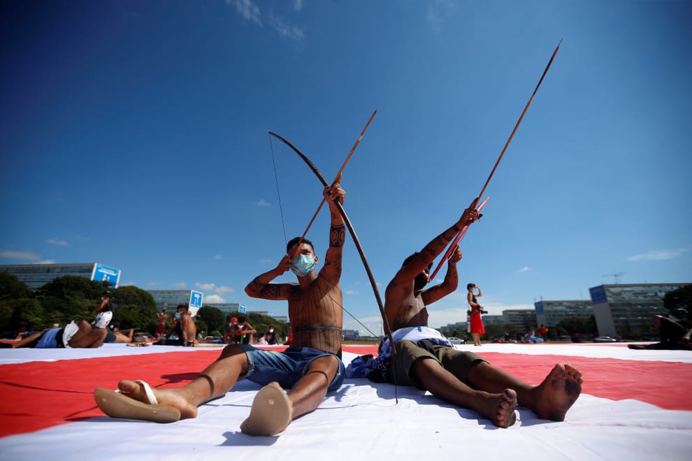 在巴西首都巴西利亞的國會大廈前,原住民們在一場守護原住民領土的示威活動上作勢要朝國會射箭。