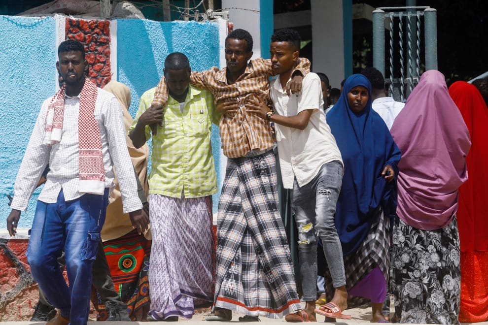 在索馬利亞首都摩加迪休(Mogadishu),周二(15),索馬利亞青年黨(Al Shabab)對摩加迪休的一座軍營發動自殺攻擊,造成至少 10人死亡、20人受傷。在送醫治療後,一名受傷的士兵被人攙扶著走出麥地那醫院(Madina Hospital)。