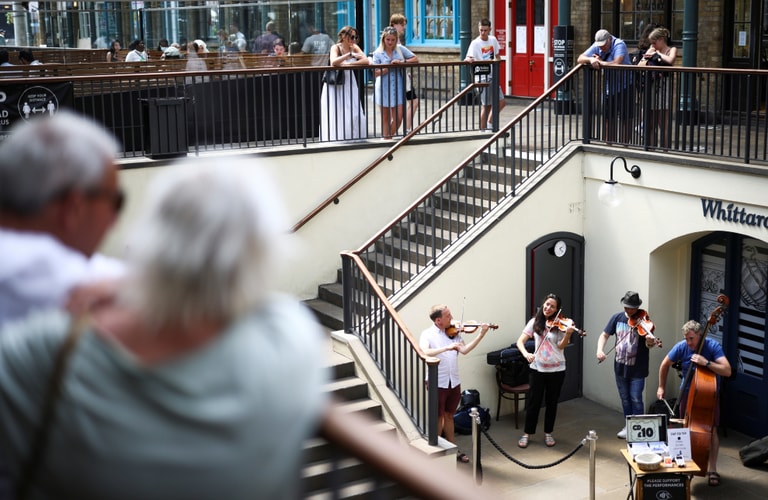 在英國首都倫敦的柯芬園(Covent Garden),人們紛紛倚在欄杆上,聆聽角落一個弦樂四重奏樂團的演奏。