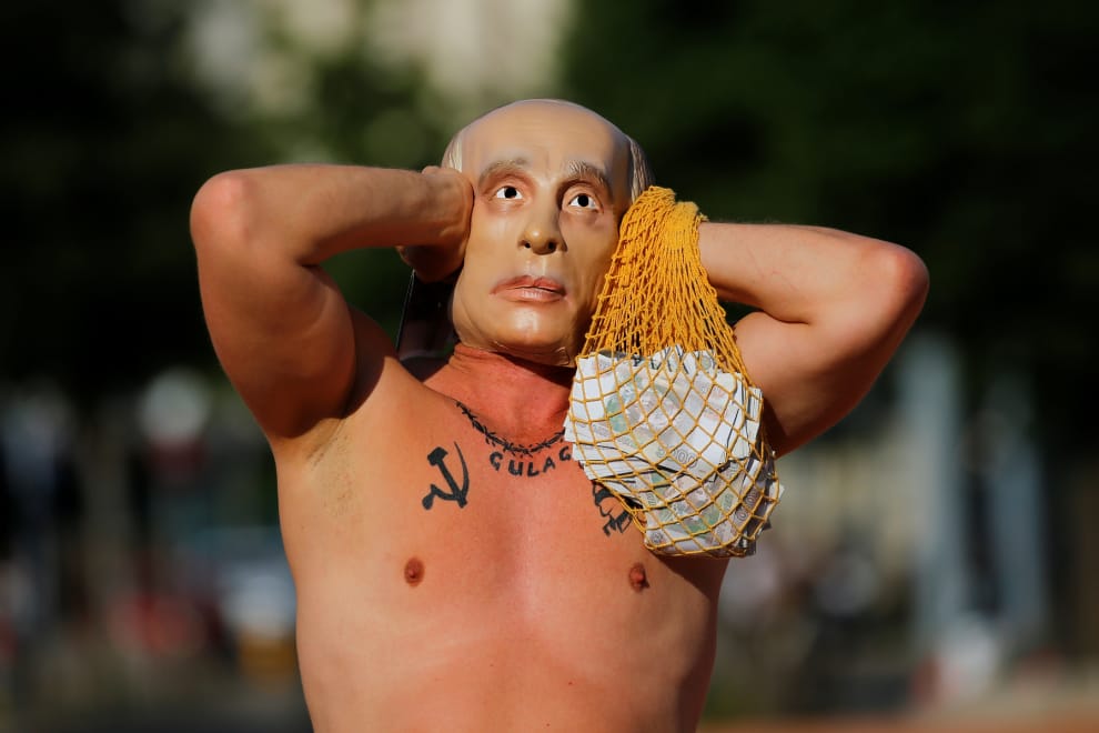 在瑞士大城日內瓦(Geneva), 一名示威者戴上俄國總統普亭(Vladimir Putin)的面具、手拿一袋假鈔上街示威。