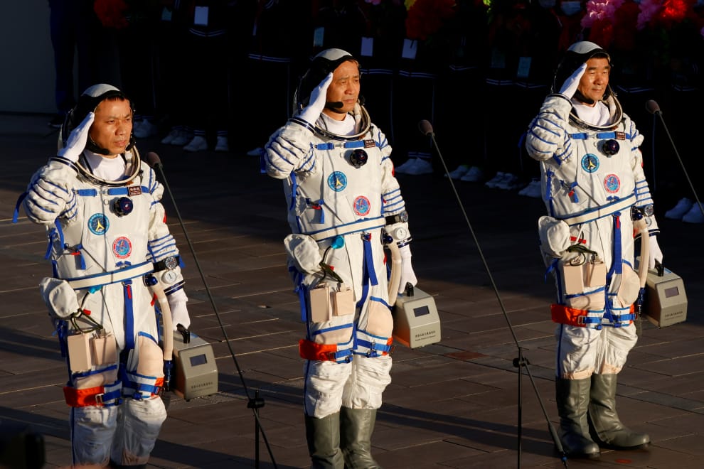 在中國甘肅省的酒泉衛星發射中心,中國太空人湯洪波(左)、聶海勝(中)、劉伯明(右)身著太空裝,準備搭上神舟 12號太空船,前往中國太空站的天和核心艙。