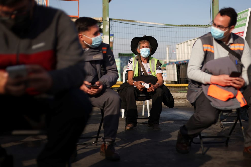 在智利首都聖地牙哥(Santiago),人們靜靜坐在智利的一座行動疫苗接種站外,排隊準備接種科興疫苗(Sinovac's CoronaVac vaccine)。