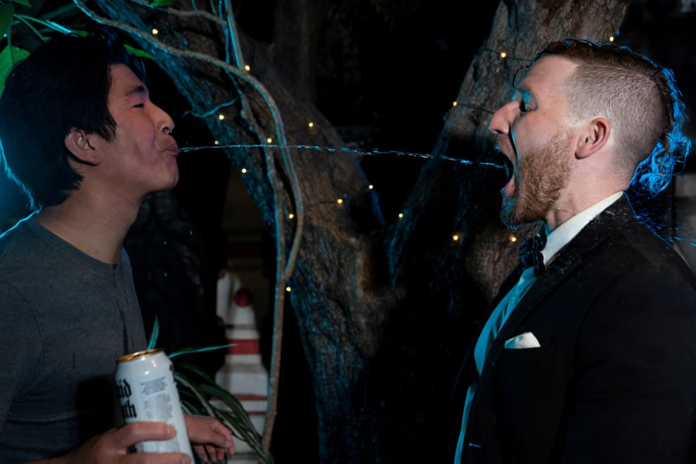 在美國加州洛杉磯的一場慶祝封鎖令解除的派對上,現年 35歲的志願者肖(Jeffrey Shiau)將嘴裡的液體,準確射入 27歲的表演者考夫曼(Sam Kaufman)的口中。