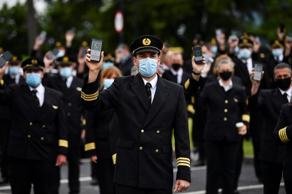 在愛爾蘭首都都柏林(Dublin)的愛爾蘭航空機師協會(Irish Air Line Pilots Association)前,愛爾蘭的機師舉起他們的COVID-19篩檢證明,向愛爾蘭政府抗議現有的國際旅行管制太嚴格。