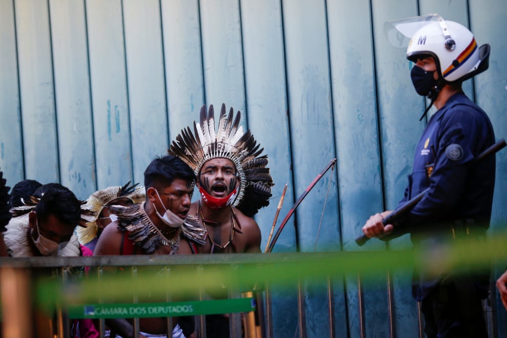 最近,數百名巴西原住民來到巴西國會外,就國會的一項土地法案展開抗議。一旦這項法案通過,過往巴西原住民們受法律保障的傳統領地面積將大幅限縮,商業農場、採礦公司也能大舉挺進,進一步開發亞馬遜雨林內的天然資源。