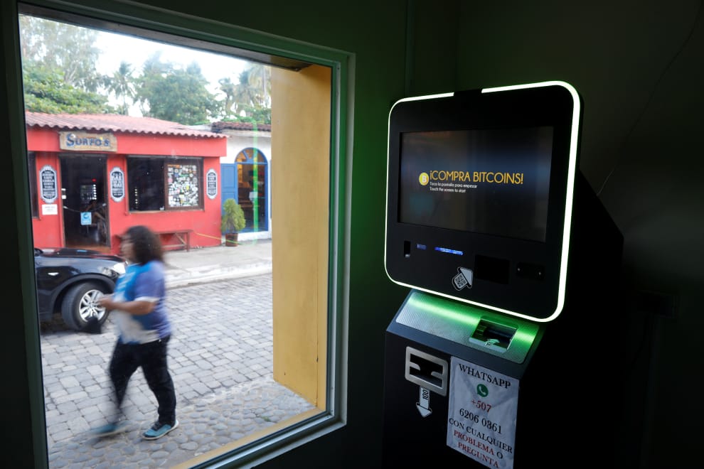 在薩爾瓦多塔馬尼克(Tamanique)埃爾通科海灘(El Tunco Beach),一台比特幣提款機在屋裡默默發著光,等著人們前來使用。